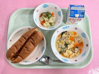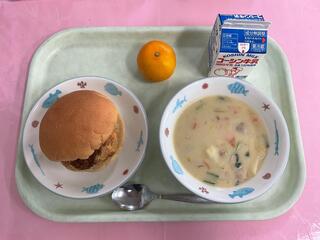 11月28日(金) 牛乳 カレーコロッケバーガー 米粉の豆乳チャウダー みかん