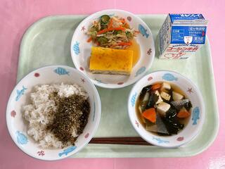 11月20日(木) 牛乳 麦入りご飯 おかかふりかけ あんかけ卵焼き ごま醤油和え 豆腐のすまし汁