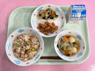 11月18日(火) 牛乳 きんぴらご飯 めひかりのから揚げ 野菜とえのきのお浸し あさりのみそ汁 早香