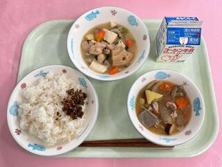 12月11日(木) 「石川県郷土料理」 牛乳 麦入りご飯 小松菜ふりかけ 治部煮 めった汁
