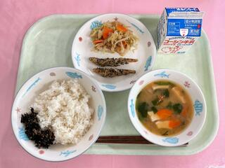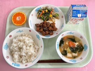 12月4日(木) 牛乳 麦入りご飯 ツナとひじきの佃煮 ちかのごま天ぷら からし和え ほうれん草のみそ汁