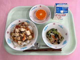 12月5日(金) 牛乳 麦入りご飯 西湖豆腐丼 もやしのコチュジャン和え みはや