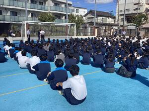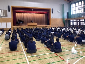 昼休みに避難訓練を行いました。友だちと過ごしていた生徒も、一人で過ごしていた生徒も、その場にいた教員の指示を聞いて迅速に行動することができました。