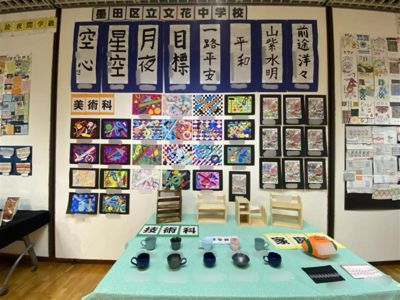 連合作品展 第57回夜間中学校作品展が、令和8年1月28日から2月1日まで、世田谷区文花生活情報センター生活工房にて開催されました。都内7校の夜間学級の作品が集結し、日ごろの学習の成果を発表しました。文花中からも国語・美術・技術・家庭科からの作品に加え、修学旅行で制作した清水焼の作品などを出品し、好評を得ました。