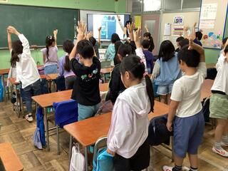 横断歩道を渡る前には「右、左、右」を合言葉にして渡ることを再確認し、教室でみんなで実践をしました。手の上げ方、目線の向け方を上手に行い、合格をもらうことができました!