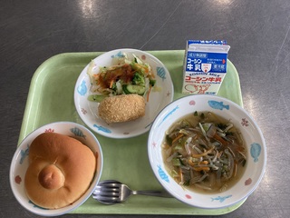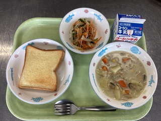 ミルクパン まめまめコロッケ ブロッコリーのサラダ もやしスープ 牛乳