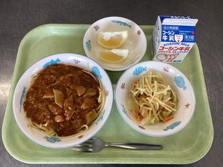 スパゲティ うみのさちソース じゃがいものハニーサラダ ひゅうがなつ 牛乳
