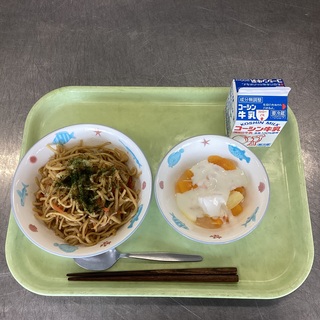 ソースやきそば アロエいりフルーツのヨーグルトがけ 牛乳