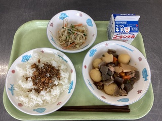 ごはん だいずのふりかけ はるやさいのにもの ごまあえ 牛乳