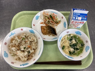 たけのこごはん さばのピりからやき もやしときゅうりのあえもの むらくもじる 牛乳
