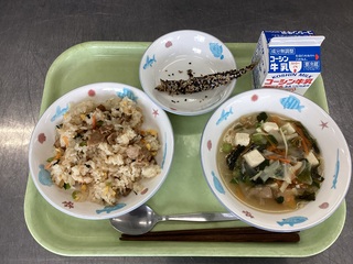 チャーハン ししゃものにしょくごまやき ごもくスープ 牛乳