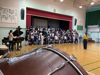12月5日(木)〜7日(土)の音楽会に向けて体育館での練習がスタートしました。体育館での練習は、学年での合同練習です。舞台の並び方から練習を始め、演奏の練習へと移ります。音楽会に向けて気持ちを高め、より良い演奏を目指して練習に励んでいます。※保護者鑑賞日は12月7日(土)