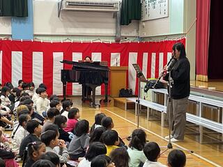 3月16日の音楽朝会では、二人の方をお招きして音楽鑑賞を行いました。楽器は、クラリネットとピアノです。リトルマーメードのアリエルなど児童が知っている音楽を数曲演奏してくださり、最後まで集中して鑑賞することができました。