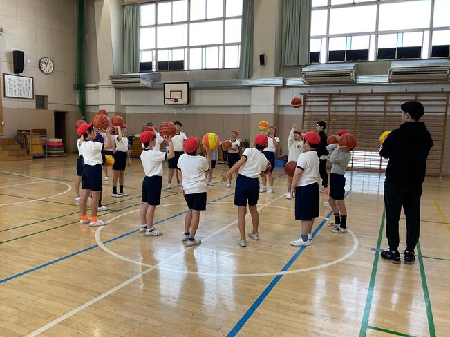 サンロッカーズのコーチの方々を講師にお招きし、バスケットボールを体験しました。ドリブルのやり方や、シュートのポイントを教えていただき練習しました。