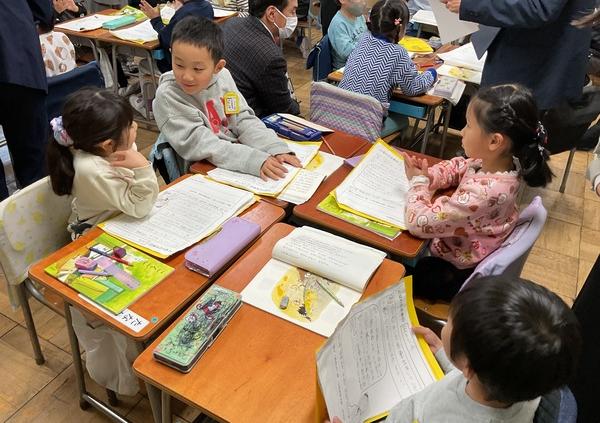 1年3組で校内研究がありました。「たぬきの糸車」を読んで、考えたことや疑問からみんなで一緒に問いを作り、授業計画を立てました。