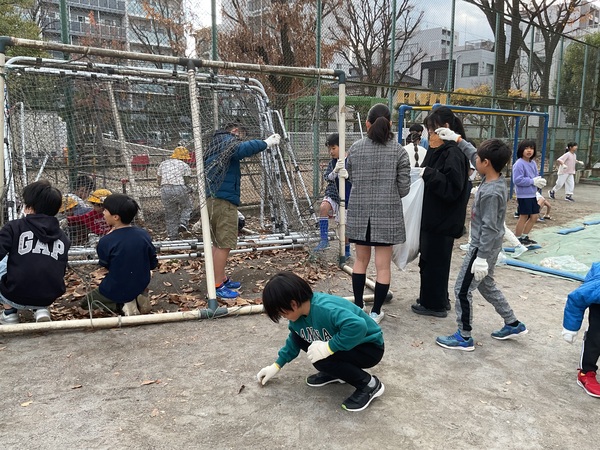 校庭を安全に使用するために小石や落ち葉を拾いました。