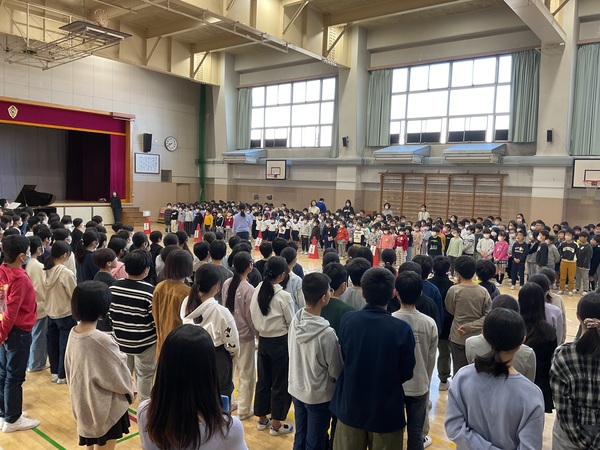 全校児童で合唱曲「Believe」を歌いました。1〜3年生、4〜6年生に分かれそれぞれ異なるメロディーで二部合唱をしました。
