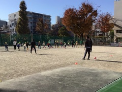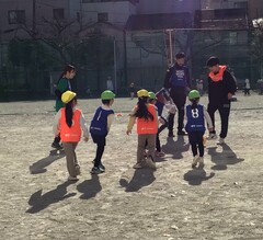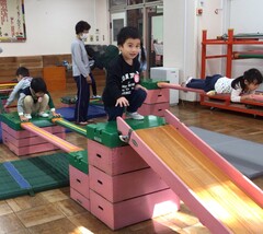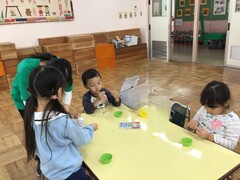 「また会えたね」「今日もよろしくね」と顔見知りの関係がどんどん深まっています。年長組は、サッカー協会から講師をお招きし、一緒にサッカー体験を行いました。年少組は、ホールで巧技台や製作を一緒に楽しみました。