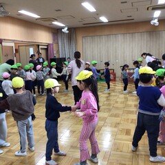 ふれあい保育 ツボタマンに来ていただき、小学校の広い体育館で親子でのびのびと遊びました。体操やボールを使って遊びました。その後、お正月遊びをしたり、巨大すごろく遊びやドッジボールを学級でしたりして、楽しい時間を過ごしました。