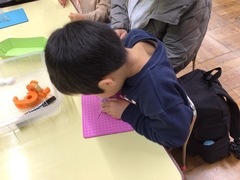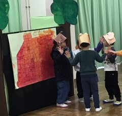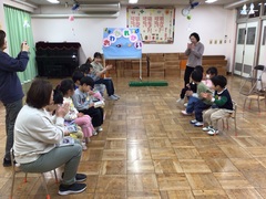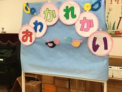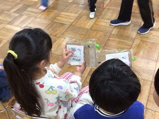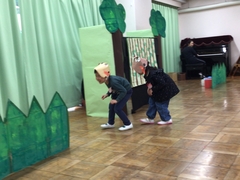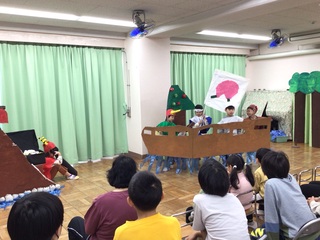 子供会に向けて、学級で取組みました。4歳児は、「3匹のこぶた」5歳児は「ももたろう」の劇をしました。小道具や大道具もみんなでつくり、大勢のお客様に見ていただくことを楽しみました。