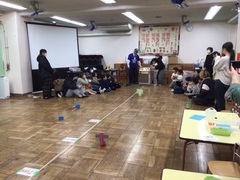2月3日 節分です。心の中の鬼や、風邪などを追い払えるように、みんなで豆まきをしました。突然、表れた大きな黒い鬼に豆をまき、みんなで追い払いました。一年間、元気に過ごせますように!