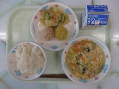 菊花団子は肉団子のまわりに、もち米をつけて蒸しました。黄色にはカレー粉を使っています。