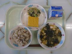 11月21日(金曜)の給食・五穀わかめごはん・和風厚焼き卵・ごまあえ・みそ汁・牛乳