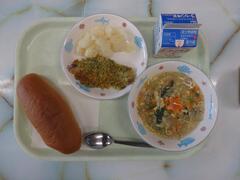 11月27日(木曜)の給食・黒砂糖パン・魚のハーブパン粉焼き・粉ふきいも・春雨スープ・牛乳