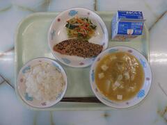 12月15日(月曜)の給食・ごはん・鮭の二色ごま焼き・からしじょうゆあえ・みそ汁・牛乳
