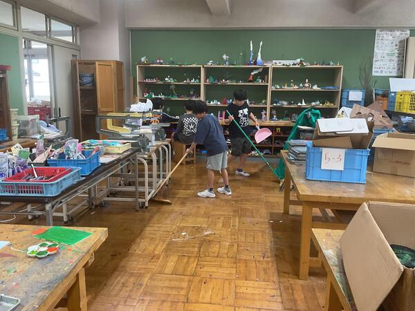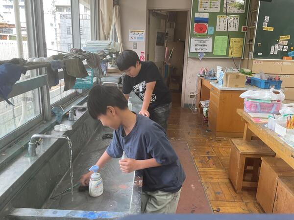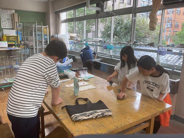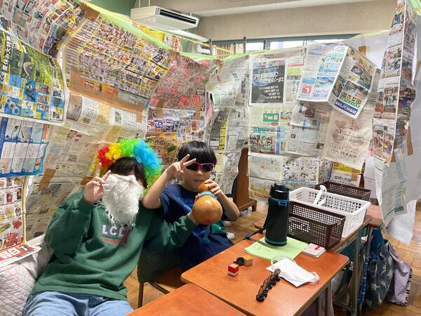 展覧会に向けて、お面作りをしています。新聞紙を1枚ずつ丁寧に貼り、その上からさらに障子紙を貼りました。みんな集中して取り組みました。
