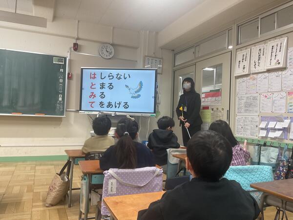 道路を渡るときには、どのように手を挙げればよいか学習しました。