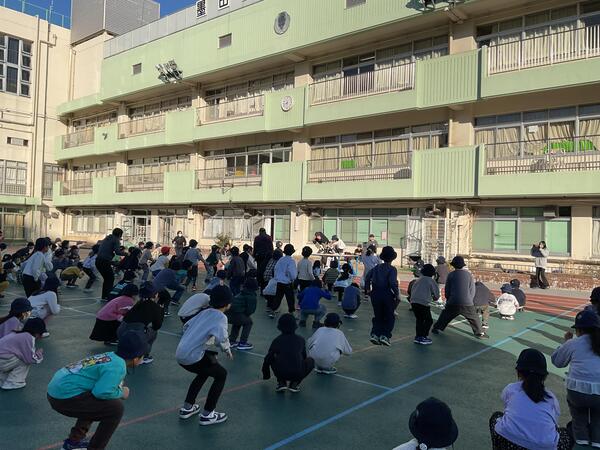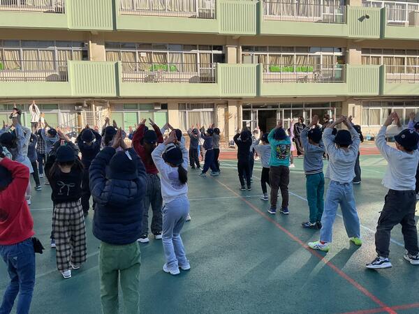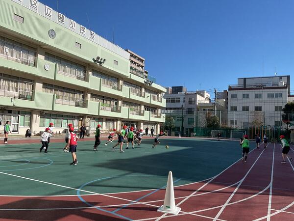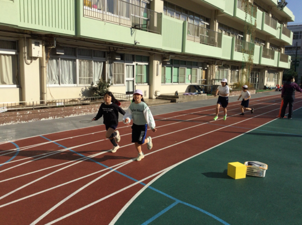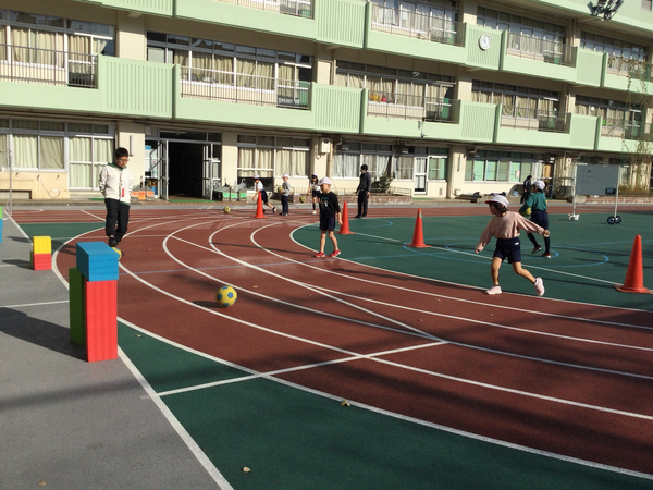 校庭体育では、ボール蹴りの学習をしています。まずは、寒さに負けないように3分間走をして体を温めます。