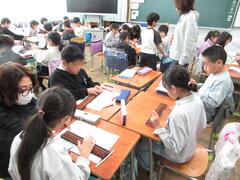 子供たちはお互いに教えあいながら、そろばんを使って正しく計算をすることができました。