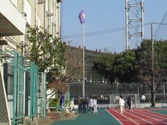 苦労しつつも頑張って取り組み、校旗が風になびいていました。