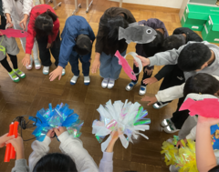 2年生は学習発表会に向けて、スイミーの劇の練習をしています。先日、本番に使用するための小道具を作りました。子たちたちがウナギやマグロの絵に合わせて、千切った色画用紙を貼り付けました。協力して、隙間がないように貼りつけスイミーに出てくる魚を作り上げることができました。