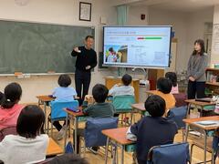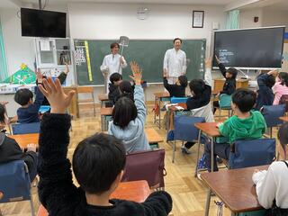 食品ロスの学習から、子供たちの最も身近な給食について考えてみました。栄養士の村上先生から、給食を作るときの4つのポイントと工夫を教えてもらいました。丁寧に細かく、安全について工夫していることやおいしく栄養バランスを考えて工夫していることが分かりました。途中、スペシャルゲストとして給食室からチーフとサブチーフの2名の方に来ていただき、調理器具の説明や体験をしました。最後に、みんなが給食をおいしいと言って食べてくれて、食缶が空になって戻ってくることが何よりもうれしいとおっしゃっていました。感謝の気持ちをもっておいしく給食を食べ、健康で元気に過ごそうという気持ちをもつことができました。