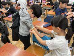 4年生の総合学習では、「みんなが暮らしやすい町づくり」について学習をしています。黒塗りした眼鏡をかけ視覚障害の疑似体験をしたり、聴覚障害のある方から手話を学んだり、体に重りやイヤーマフ、アイマスクをつけ高齢者疑似体験をしたりしました。 障害のある方や高齢者の方々の気持ちを想像することを通して、みんなが暮らしやすい町を作るには、自分たちは何ができるのだろうということを考えています。