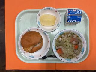 11/10 フィッシュフライバーガー 野菜のスープ煮 くだもの(りんご) 牛乳