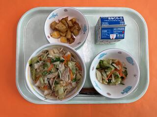 11/13 青菜と豚肉のあんかけ焼きそば のり塩ポテト くだもの(柿) 牛乳 (画像はありません。)