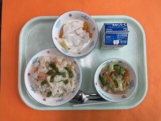 11/7 五目チャーハン じゃが芋と大豆のいそべ揚げ 中華風わかめスープ 牛乳