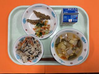 11/25 ひじき入り五目おこわ きびなごのごま揚げ おひたし けんちん汁 牛乳