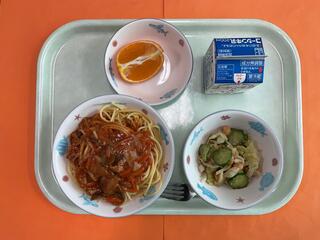 11/28 スパゲティピザソース ひよこ豆入りサラダ くだもの(夢オレンジ) 牛乳