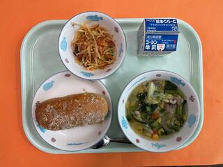 3/9 焼きカレーパン じゃがいものハニーサラダ コーン入り野菜スープ 牛乳 ★ラッキーキャロットの日★