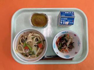 3/12 小松菜入りちゃんこうどん 海そうサラダ 小松菜ケーキ 牛乳 【6年生が考えた献立】