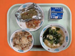 3/13 かきまぜごはん あじの磯辺揚げ すろっぽ みそ汁 牛乳 【6年生が考えた献立】