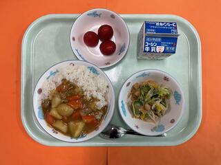 3/5 スパゲティビーンズソース 野菜サラダ くだもの(りんご) 牛乳