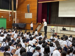 図書室でのルールやマナー、今後のイベントについて全校児童に伝えました。