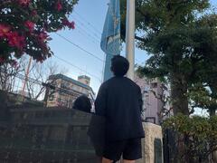 晴天の空に校旗を掲げる6年生