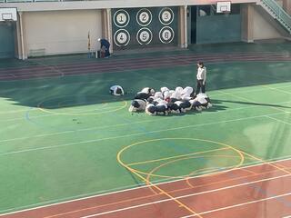 校庭で体育の授業を行っていた児童も、速やかに校庭中央へ集合し、指示に従って適切な避難姿勢を取ることができました。