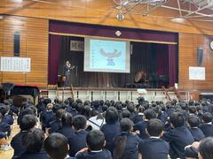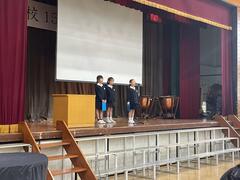 代表委員会の児童が司会進行を務め、両小に関するクイズなどを出してみんなで両小150周年をお祝いしました。